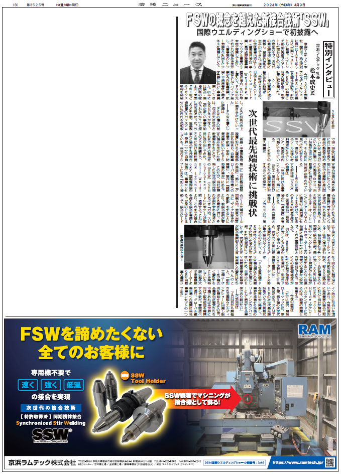 溶接ニュース 4月9日号に新接合技術『SSW』に関する記事が掲載されました